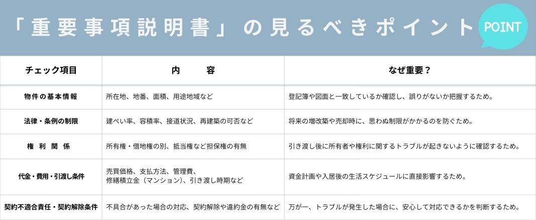 契約の前に必ず説明を受ける書類ですが、専門用語が多く「どこをチェックすればいいの?」と不安になる方も少なくありません。今回は、購入前に特に押さえておきたいポイントを解説します。